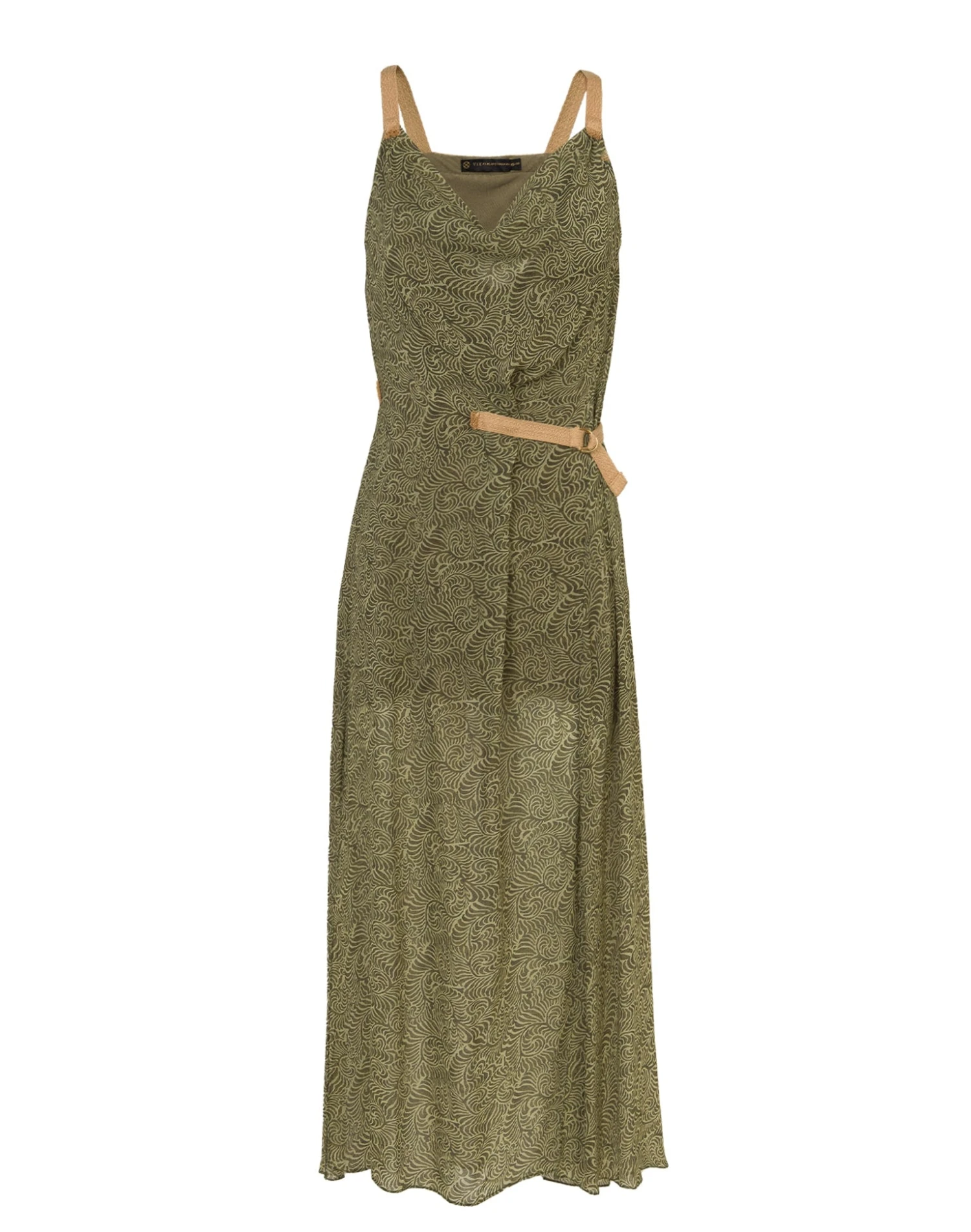 A luxurious flowy dress adorned with a rustic fixed belt and gold-coated buckle is the ideal statement piece for your getaway needs.
