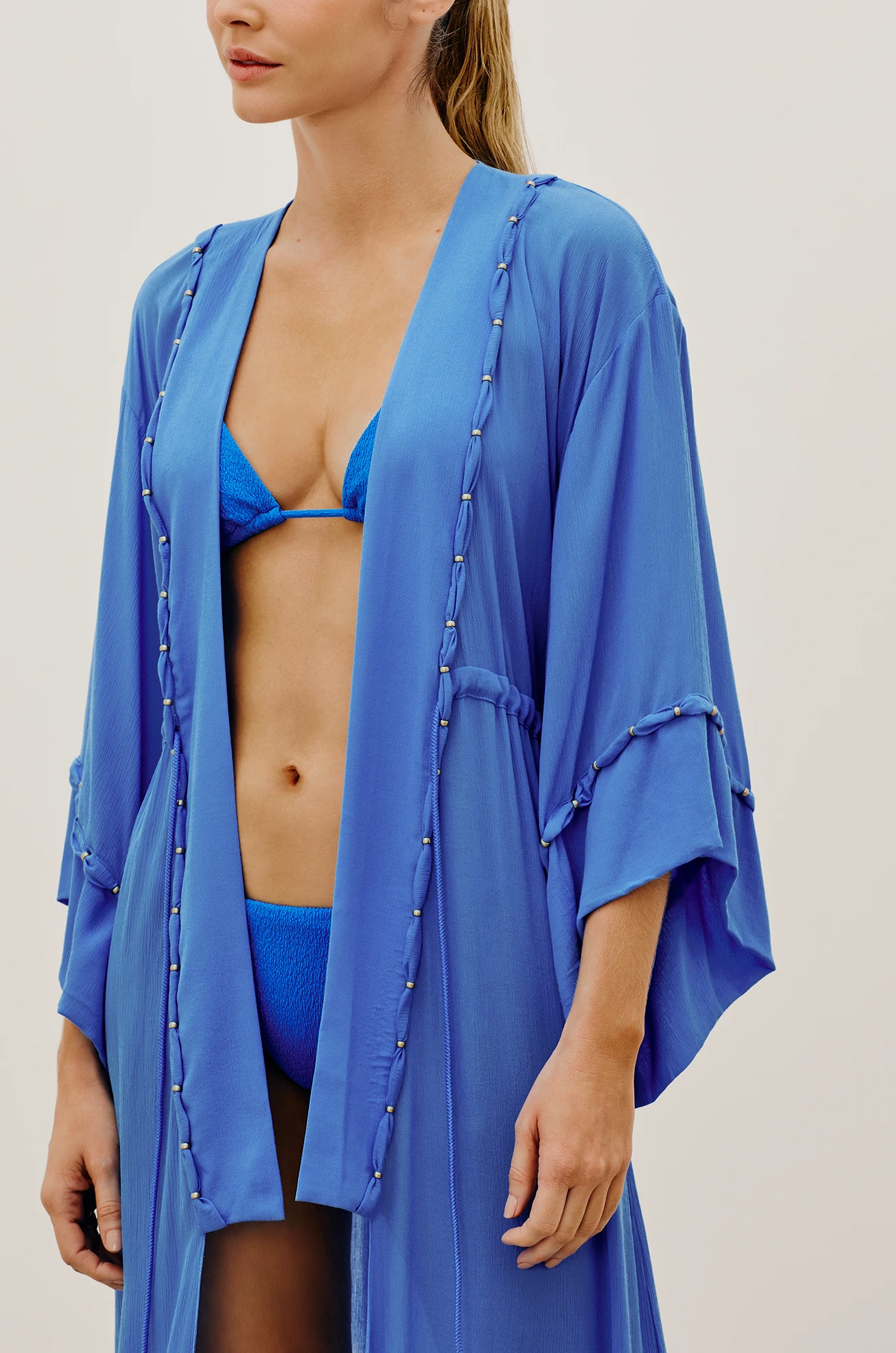 Get to and from the sand in style with the Anni Detail Long Cover Up. This long kimono is embellished with a contrasting trim embroidered with 24k gold beading and stretchy rope-like cord knotting belt that gives your swimwear an elevated and sophisticated feel.