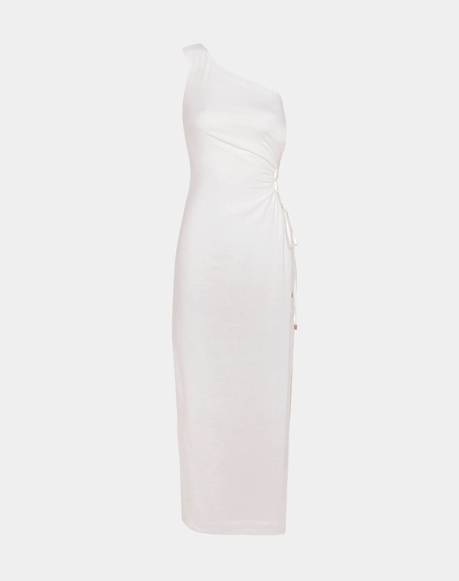 Make it a night to remember in this timeless one-shoulder design – featured in a lightweight linen blend fabric, maxi length cut, and seductive side waist cut-out with 24k gold-cap ties that adjust to your liking for a striking look that is sure to get you noticed.