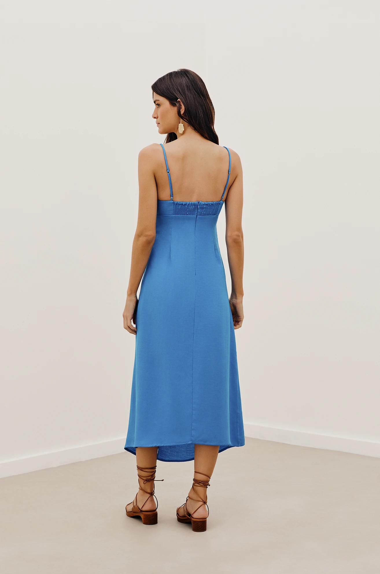 Step into your day feeling sophisticated and glamorous with the Carrie Midi Dress. A form fitted bodice, flirty keyhole cutout with a 24k gold clasp and fold-over surplice neckline that provides a practical yet playful attire for any social gathering.