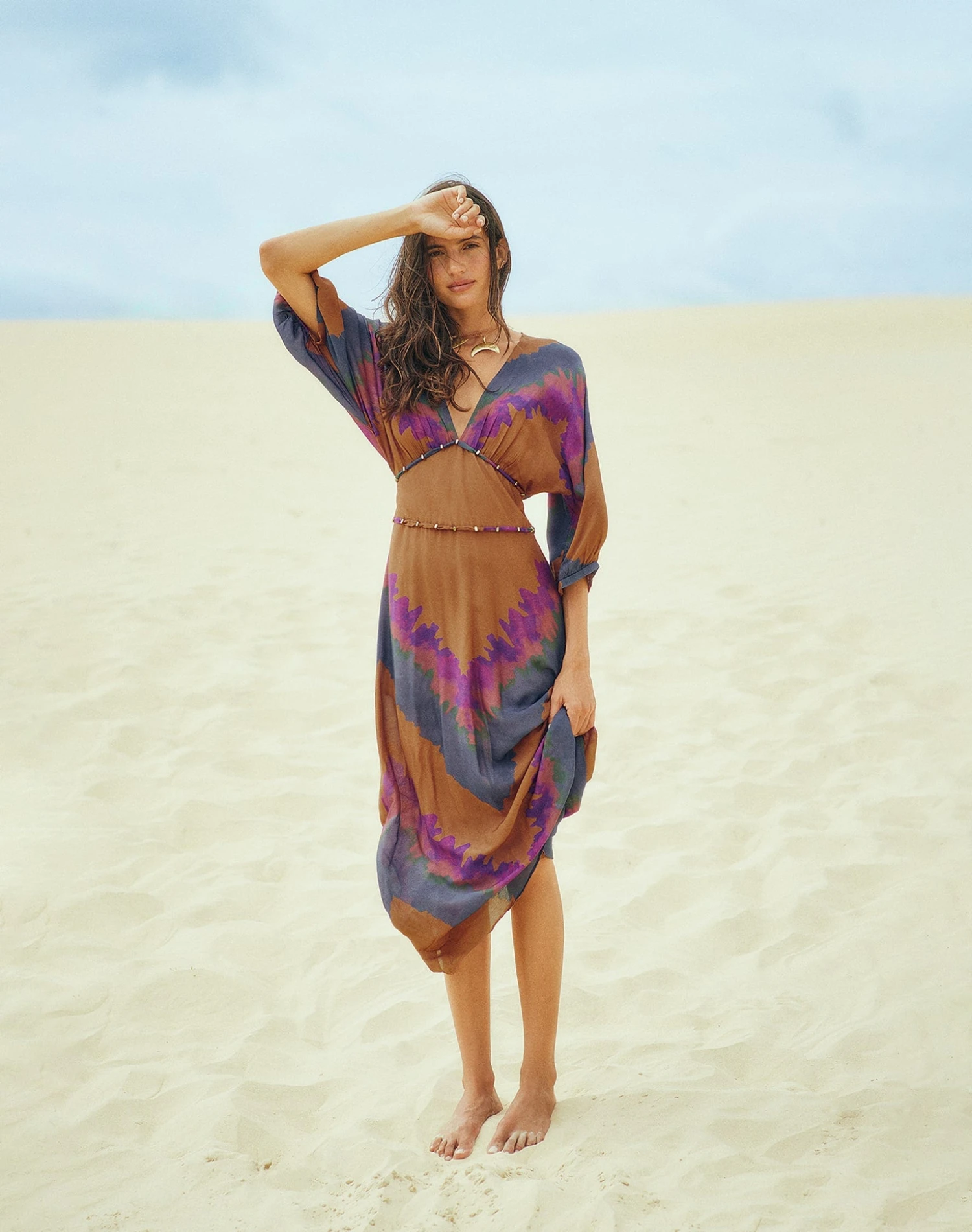 Around the world in style with the Chris Detail Midi Dress which features a plunging neckline, a wide waistband embellished with 24k gold studs and relaxed bodice for comfort.