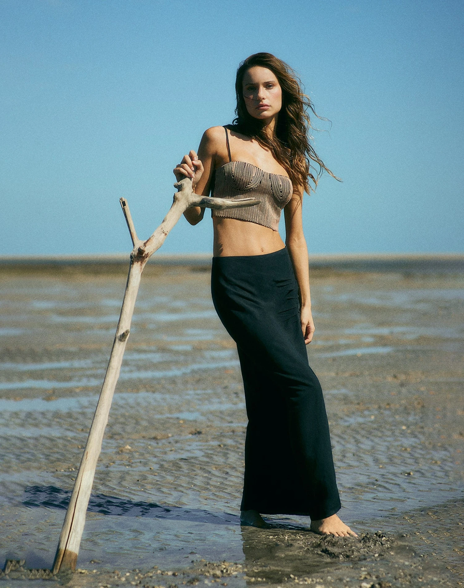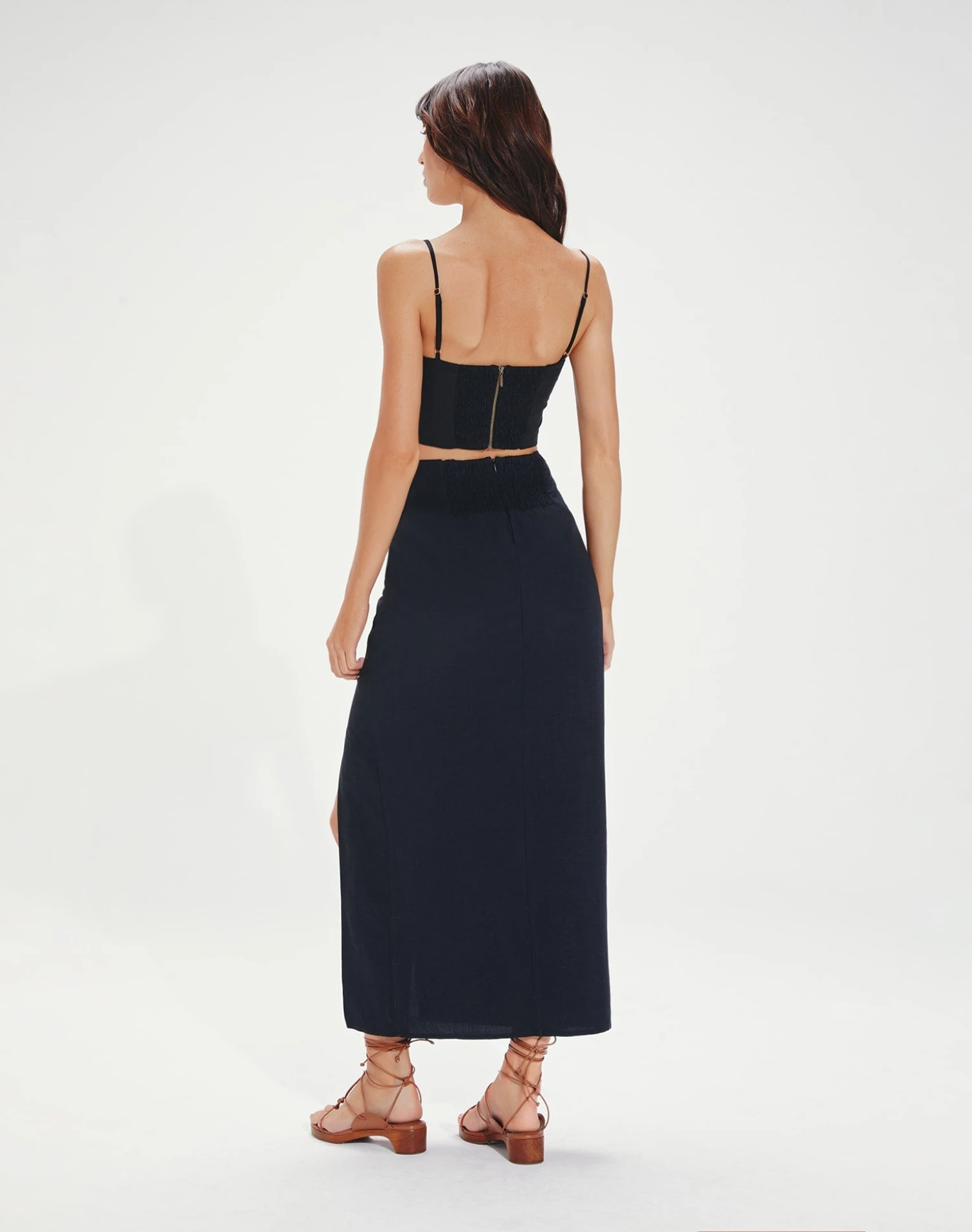 Feel confident, stylish, and sexy with the Clara long skirt; its high side slit and ruching detailing will hug your curves making this a staple for all your travel adventures.