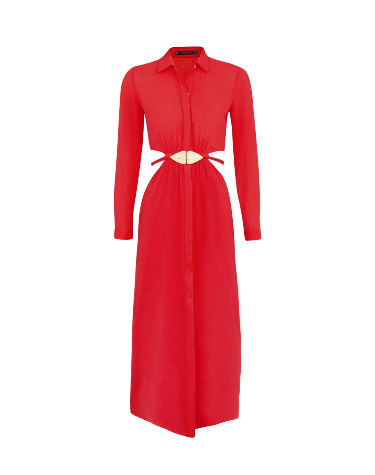 Sun, sand, and unparalleled glamour in the Dandara Detail Long Dress, a shirt-like silhouette that will cause a fashion sensation anywhere you decide to flaunt this astonishing number. This button-down design is accentuated in luxury with an adjustable 24k gold-plated pendant belt, sultry cut-outs, and shaped in a lightweight linen blend fabric ideal for sunshine seeking occasions.