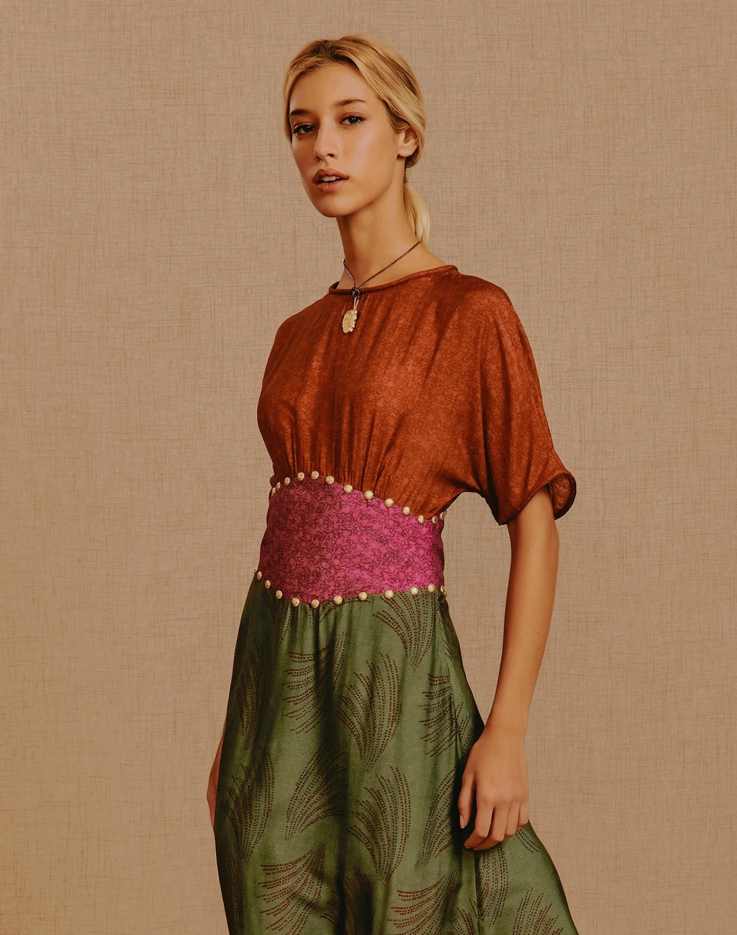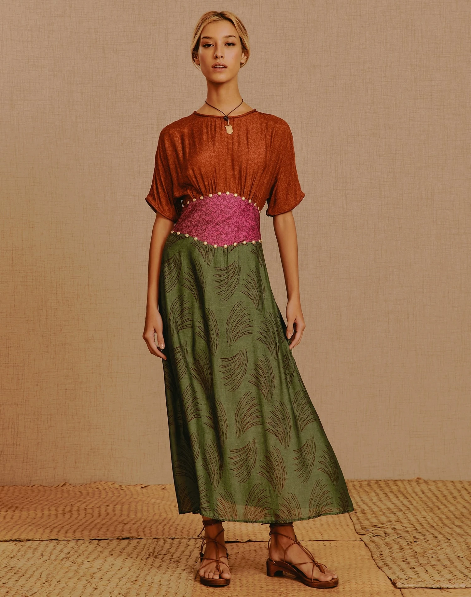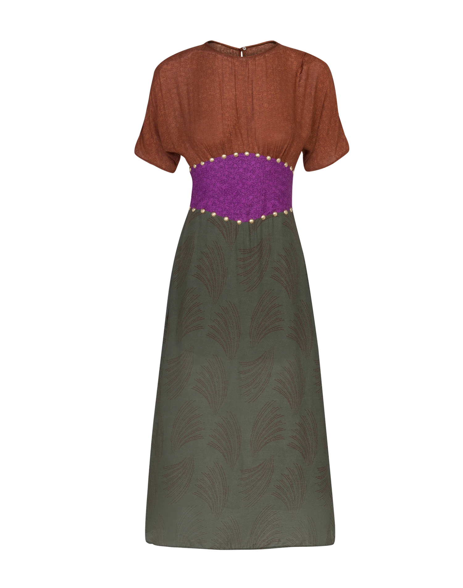 Long dress with a clash of three different prints from the collection. Short sleeves, a loose top in Camel tone, a fitted waist marked by cutouts with metal application in Gya Lotus print, and an A-line skirt in Volpi Green print.