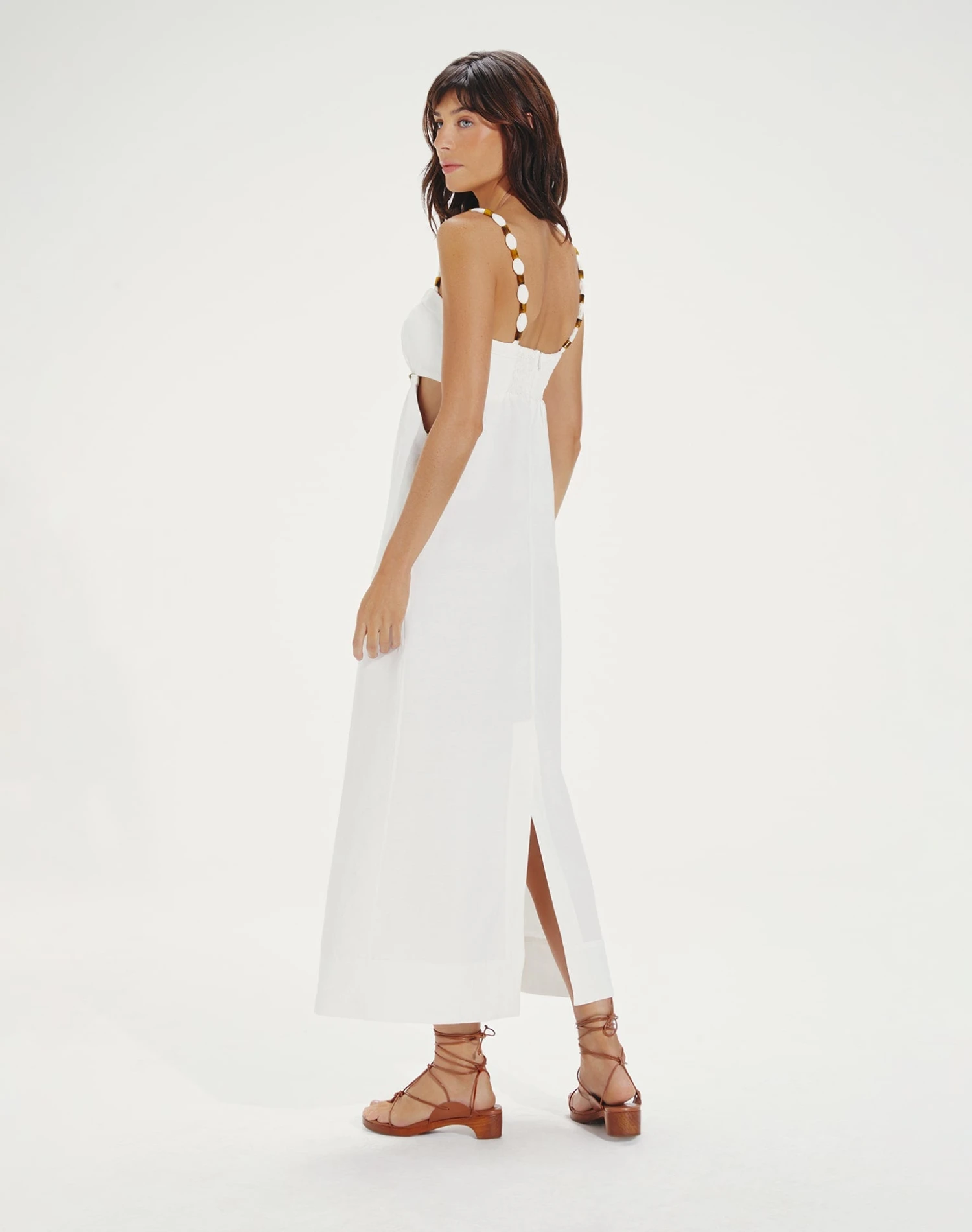Fabric dreams are made of this, a lavish and stylish maxi dress to show off in. The Isadora Detail Long Dress features a linen blend fabric artisanally embellished with tortoiseshell resin and fabric-covered oval beading trims throughout the bodice of this piece.