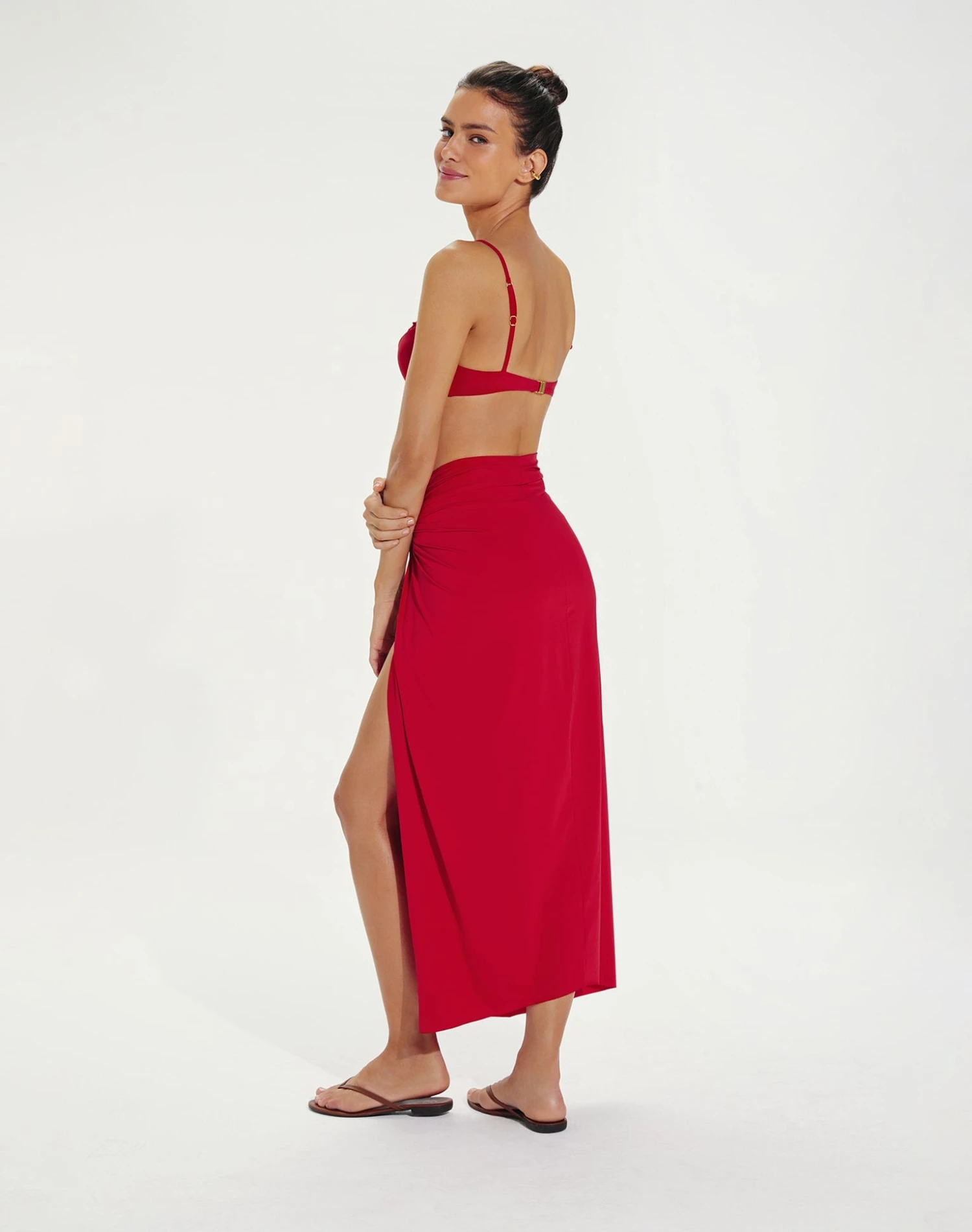 Add an extra layer of femininity to your swimwear with the Karen Midi Skirt, the perfect accessory to compliment your seaside look. This sultry cover up is designed in our iconic Brazilian lycra, with knot detail and pronounced side slit.