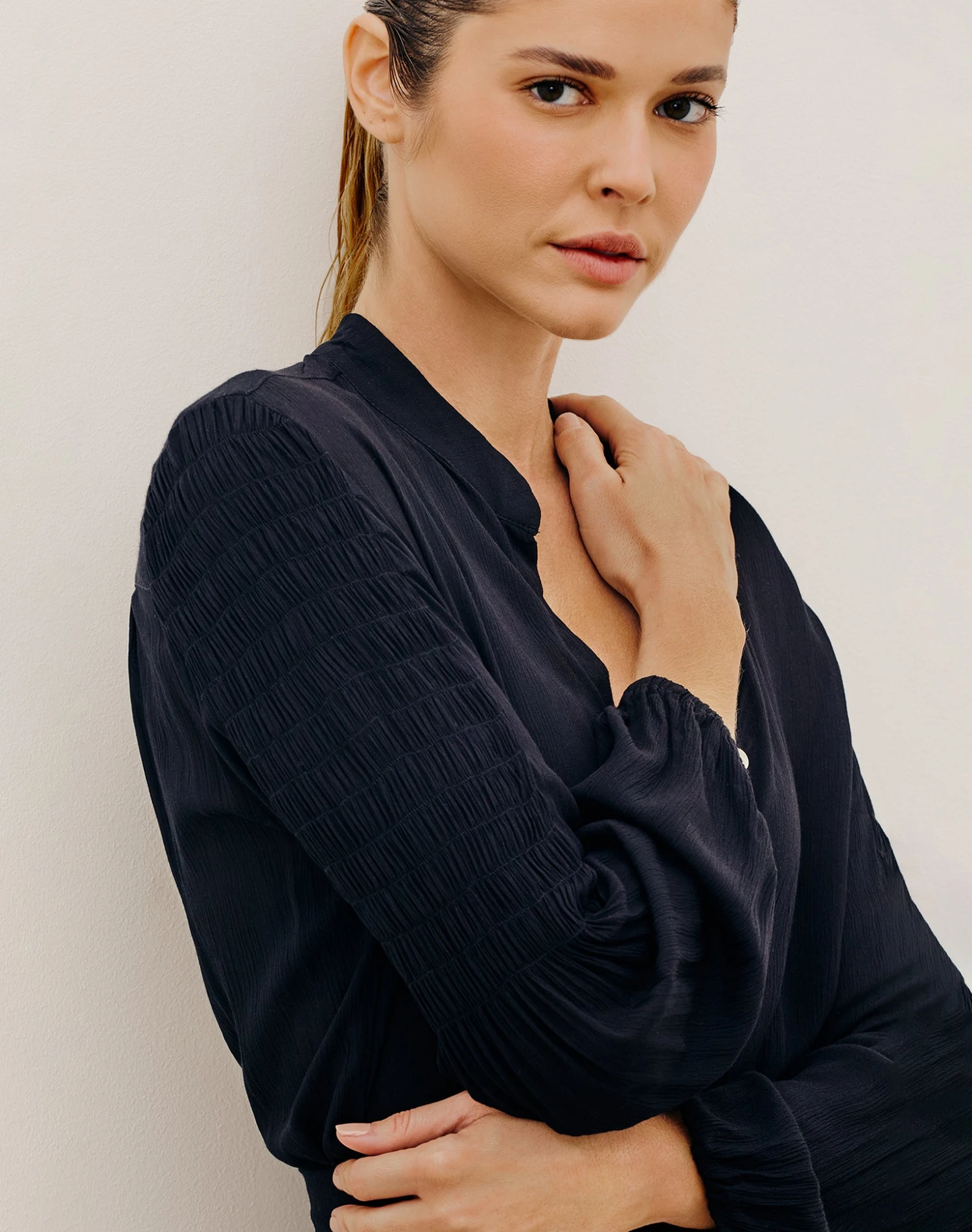 Short chemise cover-up with full opening by buttons aligned vertically in the center, “V” neckline, long sleeves, fabric strap fastening at the waist.