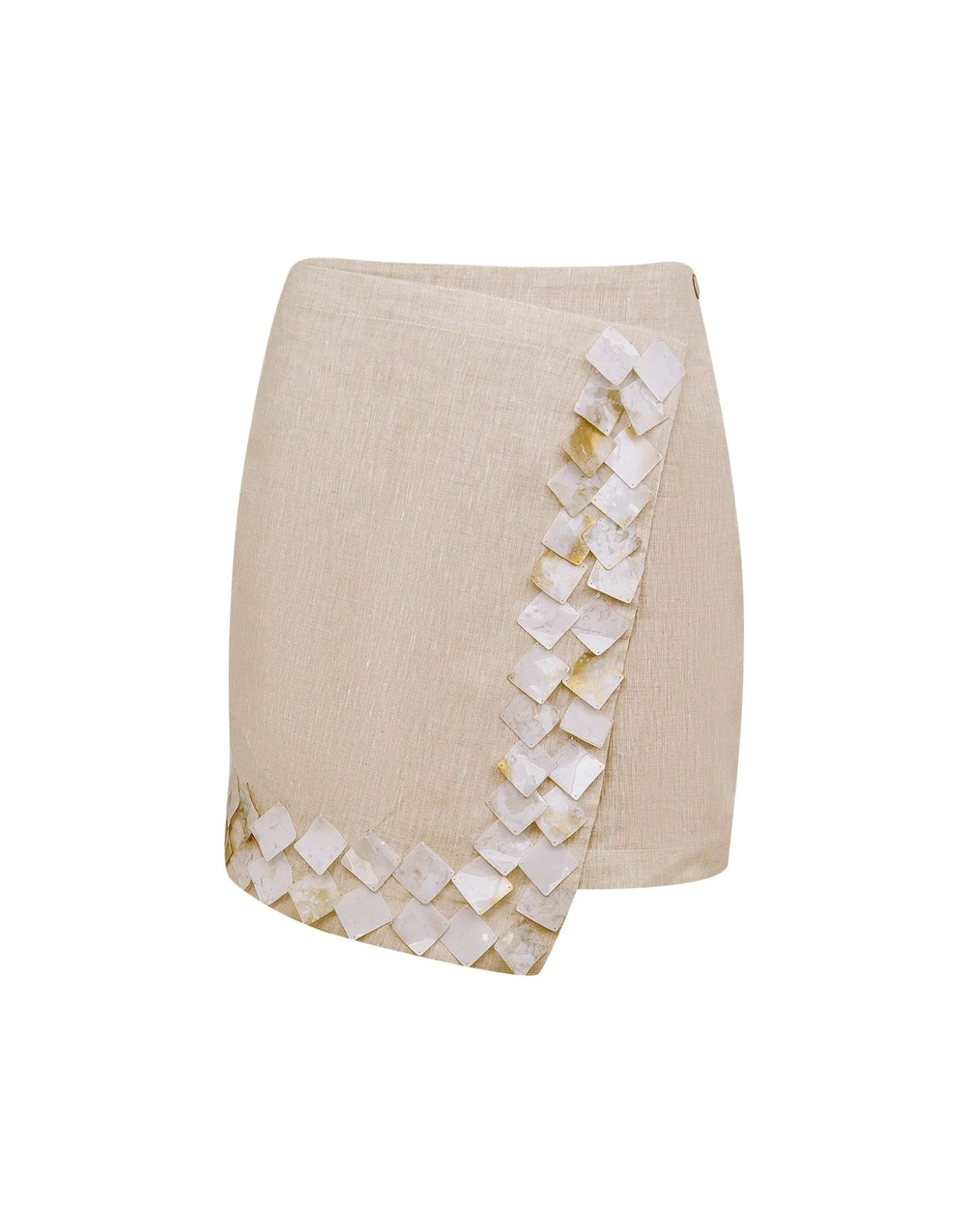 Embrace your femininity in the statement-making Meire Mini Skirt, a sultry yet sophisticated designed to showcase your creativity. Show yourself off in this asymmetric piece fashioned in a linen-blend bodice heightened by artisanally made shell trim, adding a layer of flair to this timeless work of art.