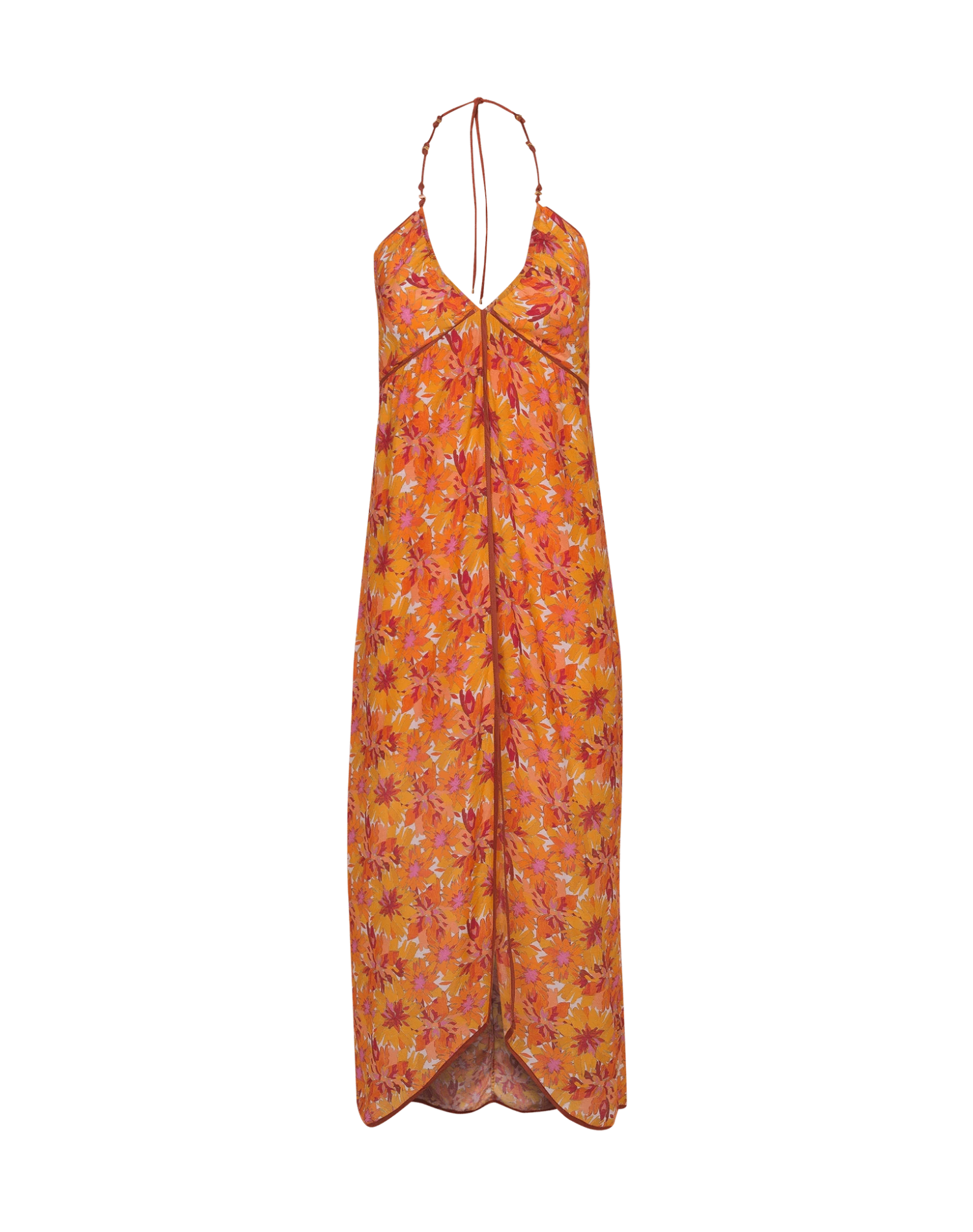 Dress with a thin strap at the neck with knots and metal trims. Opening in āVā in the center of the bust