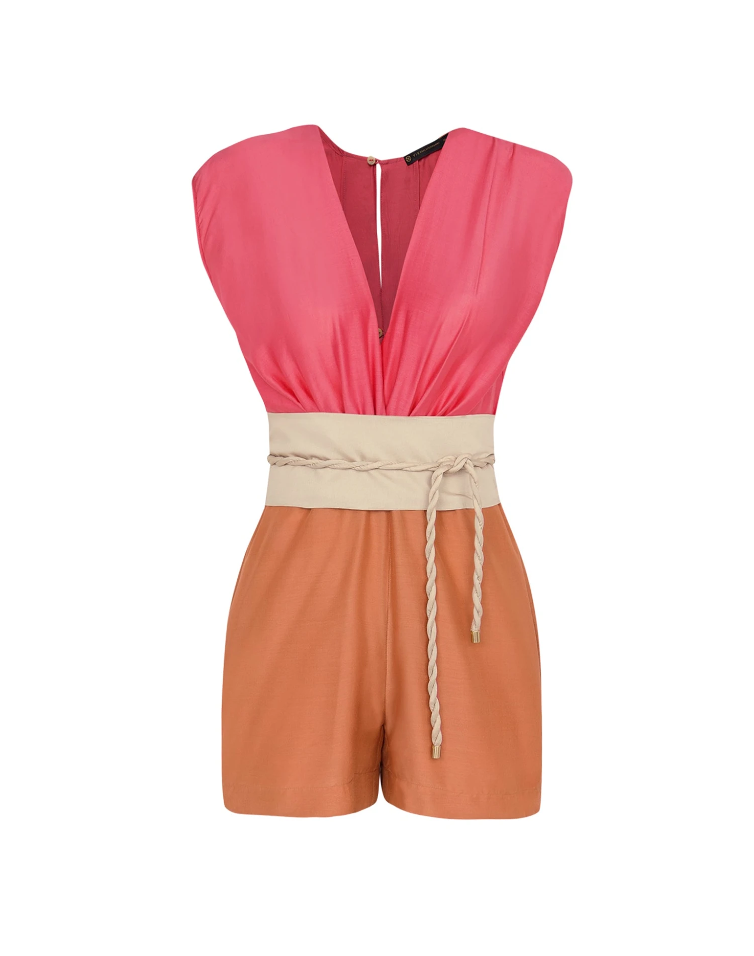 Take a break from your daily routine and embark on your next getaway in style with the Noami Mini Jumper, a design made to dazzle and delight. This sleeveless color-blocked beauty is fashioned in a silk feel fabric draped neckline, and a striking wide belt that adds a layer of luxury and playfulness to your one-piece attire.