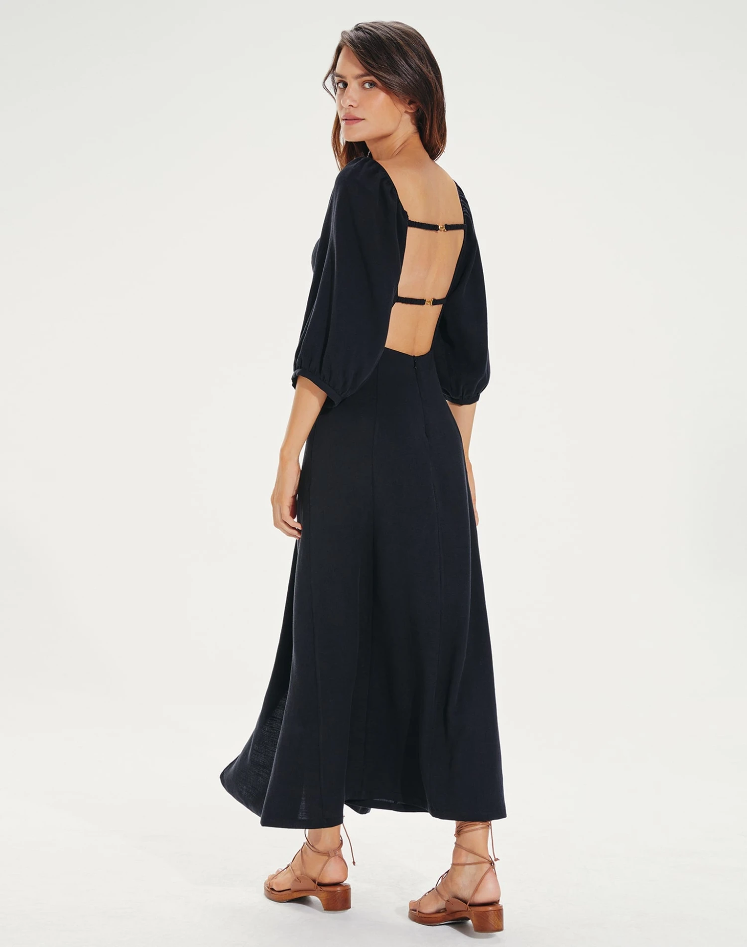 A beautiful dress with bralette cups, 3/4 length sleeves, slit down the middle for a sexy flare.