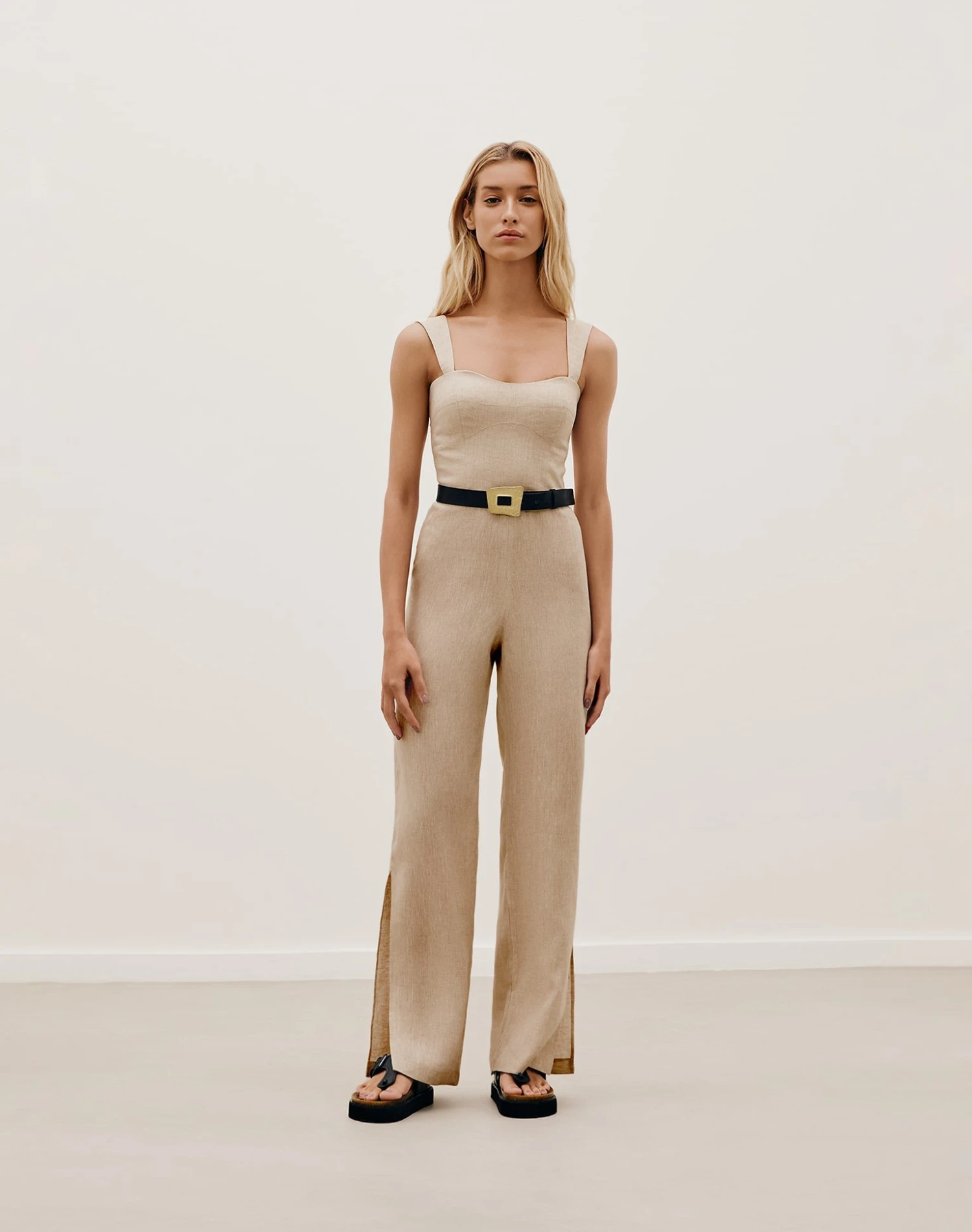 Coveted all-in-one silhouette takes center stage in the Samy Jumpsuit, a one-piece wonderous design that will elevate your style instantaneously. Majestically crafted in linen-blend fabric, structured bust, capped sleeves, and a wide leg with a versatile side slit hem.